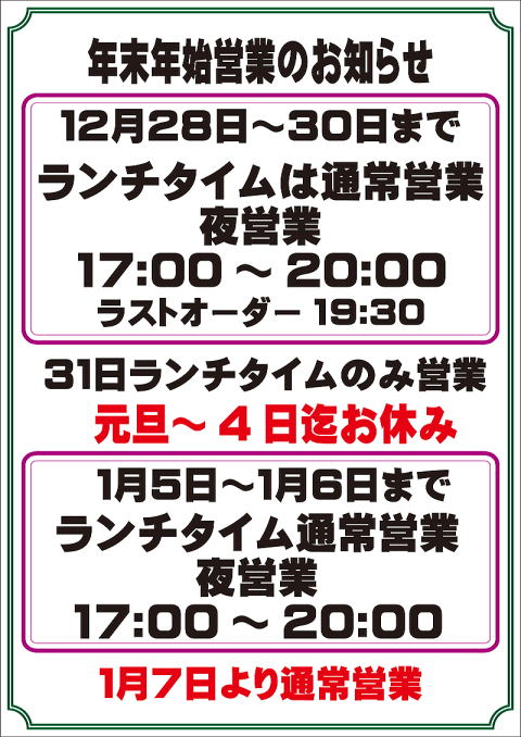 | お知らせ 毎度格別のご愛顧を賜り 誠にありがとうございます 本年2024年10月より定休日及び 日曜日の営業時間が変更となります 何卒宜しくお願い申し揚げます |